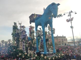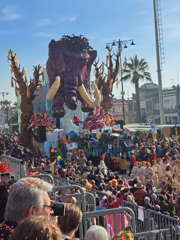 In questo angolo di vivace e mondana Toscana - Viareggio è in provincia di Lucca - la kermesse carnascialesca si è aperta quest'anno tra mostre d'arte, concerti, feste, presentazioni di libri e tantissimi ospiti illustri, per un momento di grande riflessione culturale con le allegorie realizzate dagli artisti della cartapesta. Messaggi per un futuro migliore e più sostenibile con una sfilata sui Viali a Mare di nove carri di prima categoria, quattro di seconda, otto mascherate di gruppo e otto isolate, insieme alle pedane aggregative fuori concorso. Tanti sogni, speranze e desideri di un mondo migliore da vivere in serenità. Domenica, alle 15 del pomeriggio, l'inizio ufficiale della Sfilata, ma negli hangar della Cittadella era già possibile nel mattino scoprire forme e colori delle nuove creazioni mentre nell'Hangar 16 l'Espace Gilbert accoglieva l'omaggio a Sergio Staino e alla sua matita sempre pungente, soave e festosa.
