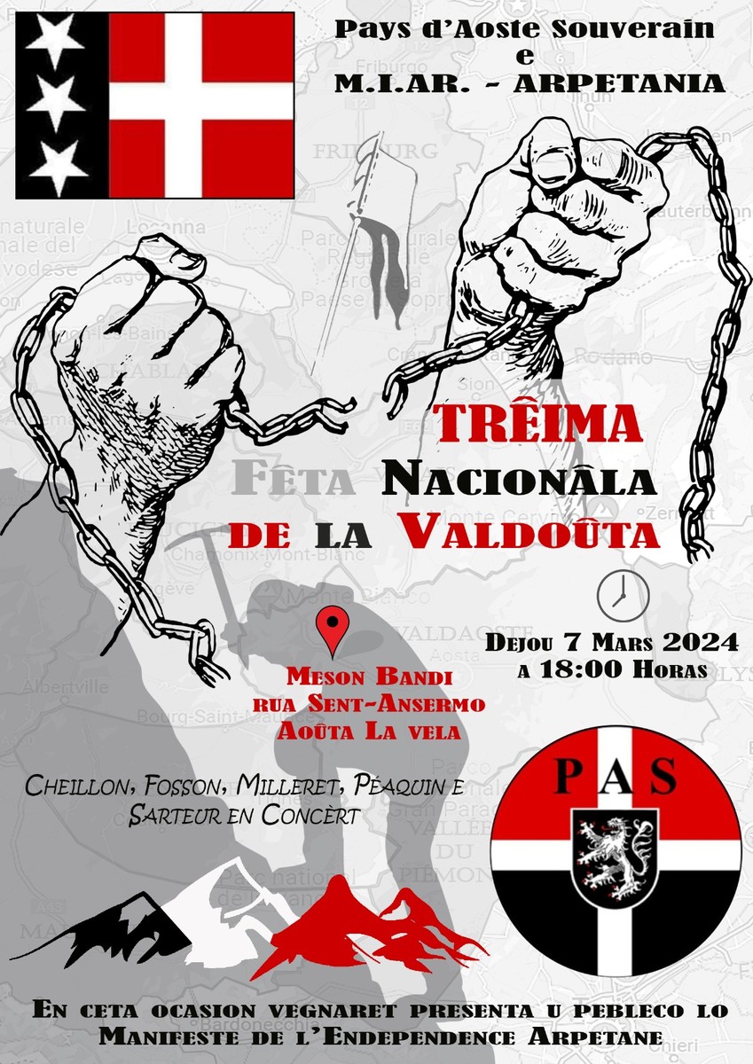 La Festa si aprirà alle ore 17 con Joseph Henriet che presenterà il Manifesto dell'Indipendenza Arpitana. Interverranno il Presidente di Pays d'Aoste Souverain Michel Perret con il Responsabile politico Christian Sarteur oltre che Daniela Amato, responsabile del Progetto Arpitania all'interno di PAS e Floran Corradin che ha affiancato Joseph Henriet nella produzione del Manifesto.