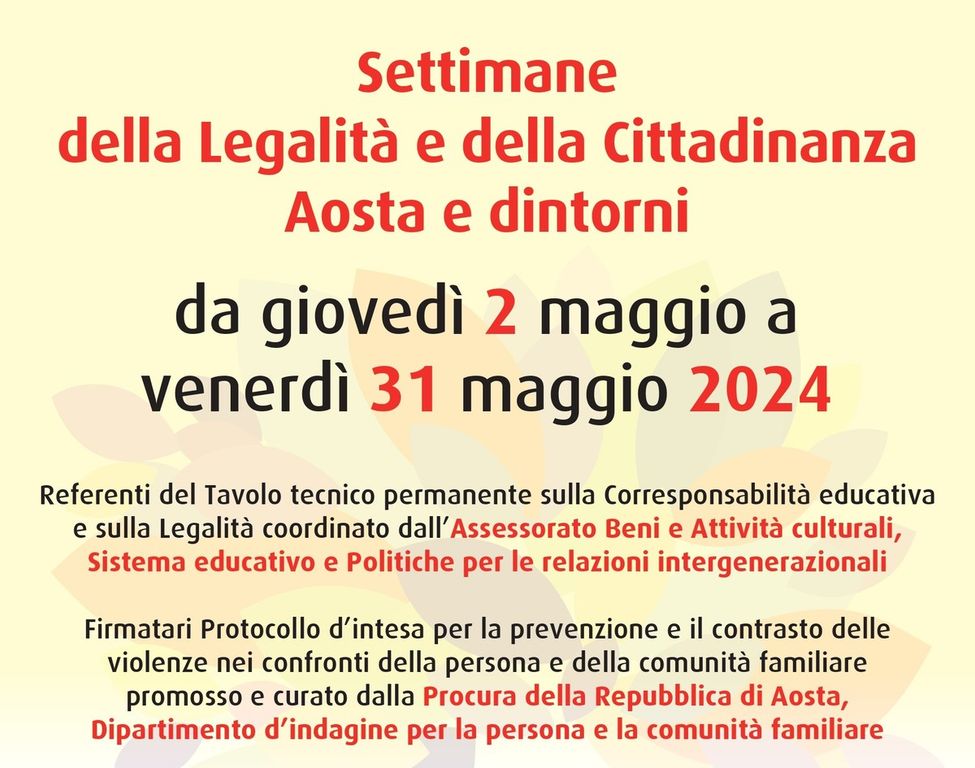 L’Assessorato dei Beni e Attività culturali, Sistema educativo e Politiche per le relazioni intergenerazionali informa che da oggi, giovedì 2 maggio prenderà avvio il mese della legalità e della cittadinanza Aosta e dintorni che coinvolgerà non solo il capoluogo regionale, ma diversi paesi del territorio regionale, nella realizzazione di attività laboratoriali, incontri tematici e forum in presenza e con la collaborazione di Enti e Associazioni.