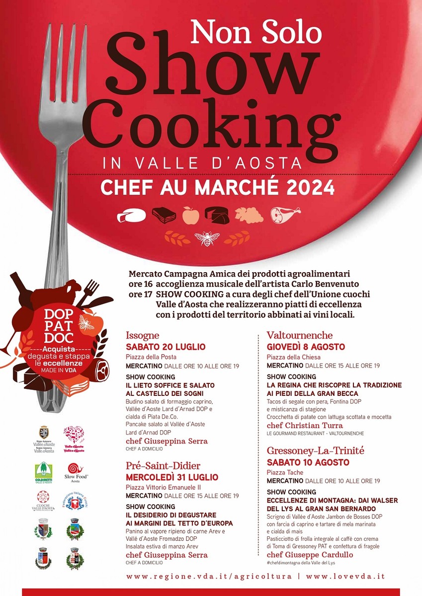 I quattro appuntamenti previsti nel corso dell’estate 2024 sono ideati e realizzati dall’Assessorato in collaborazione con Coldiretti Valle d’Aosta, Unione Regionale Cuochi Valle d’Aosta, Slow-food Valle d’Aosta e con il supporto logistico dei Comuni che ospiteranno le varie tappe in calendario: Issogne, Pré-Saint-Didier, Valtournenche e Gressoney-La-Trinité.