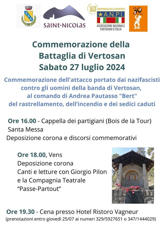 A Saint-Nicolas si terrà invece un evento volto a ricordare la “Banda Vertosan”. All’ufficialità del momento commemorativo tenuto con la messa nella cappella dei partigiani caduti durante l’eccidio nazifascista del 30 luglio 1944, si affiancherà, per il deciso anno consecutivo e grazie al supporto di Anna Castiglion e Marco Vagneur, un’iniziativa collaterale, nel villaggio di Vens, atta a approfondire, diffondere e mantenere viva la memoria.