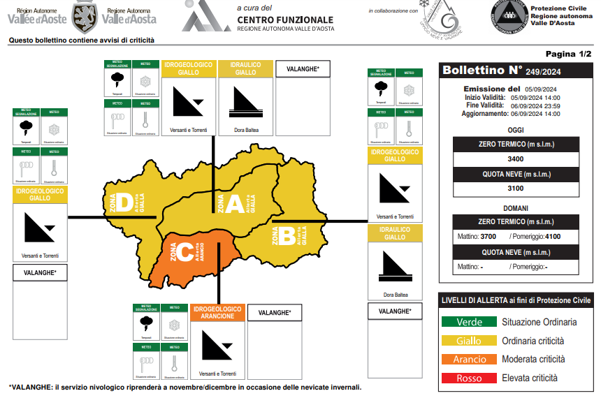 Nel pomeriggio, le precipitazioni si concentreranno soprattutto nel settore orientale della regione, con un progressivo esaurimento delle piogge previsto in serata. Nonostante il miglioramento generale, i livelli dei corsi d'acqua in Valle d'Aosta restano elevati, specialmente nelle zone B e C.