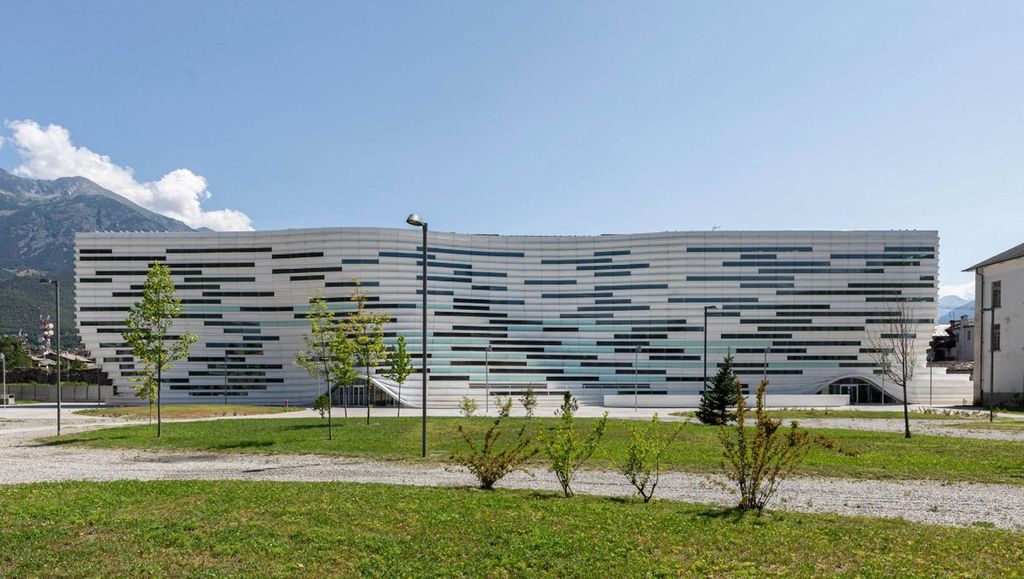 A tale fine, sono indispensabili alcune sintetiche premesse. La concezione architettonica dell’edificio, curata dallo studio MCA (Mario Cucinella Architects), fin dalla sua prima proposizione ha evidenziato i propri caratteri formali marcatamente innovativi nel panorama valdostano. La facciata ovest è di tipo composito e risulta costituita da una messe di elementi e materiali diversi e singolarmente unici. Forniamo alcuni “numeri”: n. 39 costolature (centine di sostegno) d’acciaio, ognuna di diversa sagoma e sviluppo; n. 2040 elementi rivestiti in materiale acrilico/minerale (tipo Corian), ognuno di diversa dimensione e geometria; n. 36.000 elementi e componenti che costituiscono complessivamente la facciata; ed infine, 25.000 metri (25 km) è lo sviluppo dei giunti siliconici realizzati al fine di garantire la tenuta all’acqua fra i vari elementi verticali e orizzontali.