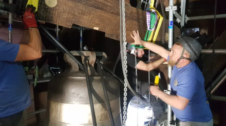 Le campane sono tornate trionfalmente a Notre Dame lo scorso 12 settembre, e sono state montate in dieci giorni di lavoro. Si tratta di otto campane, di cui due danneggiate dall’incendio della cattedrale e ora restaurate. Sono state issate, una per una, in cima al campanile nord, a l'altezza del timpano ovest. Un lavoro delicato durante il quale i campanisti hanno dovuto destreggiarsi con tecniche tra arcaismo e modernità.