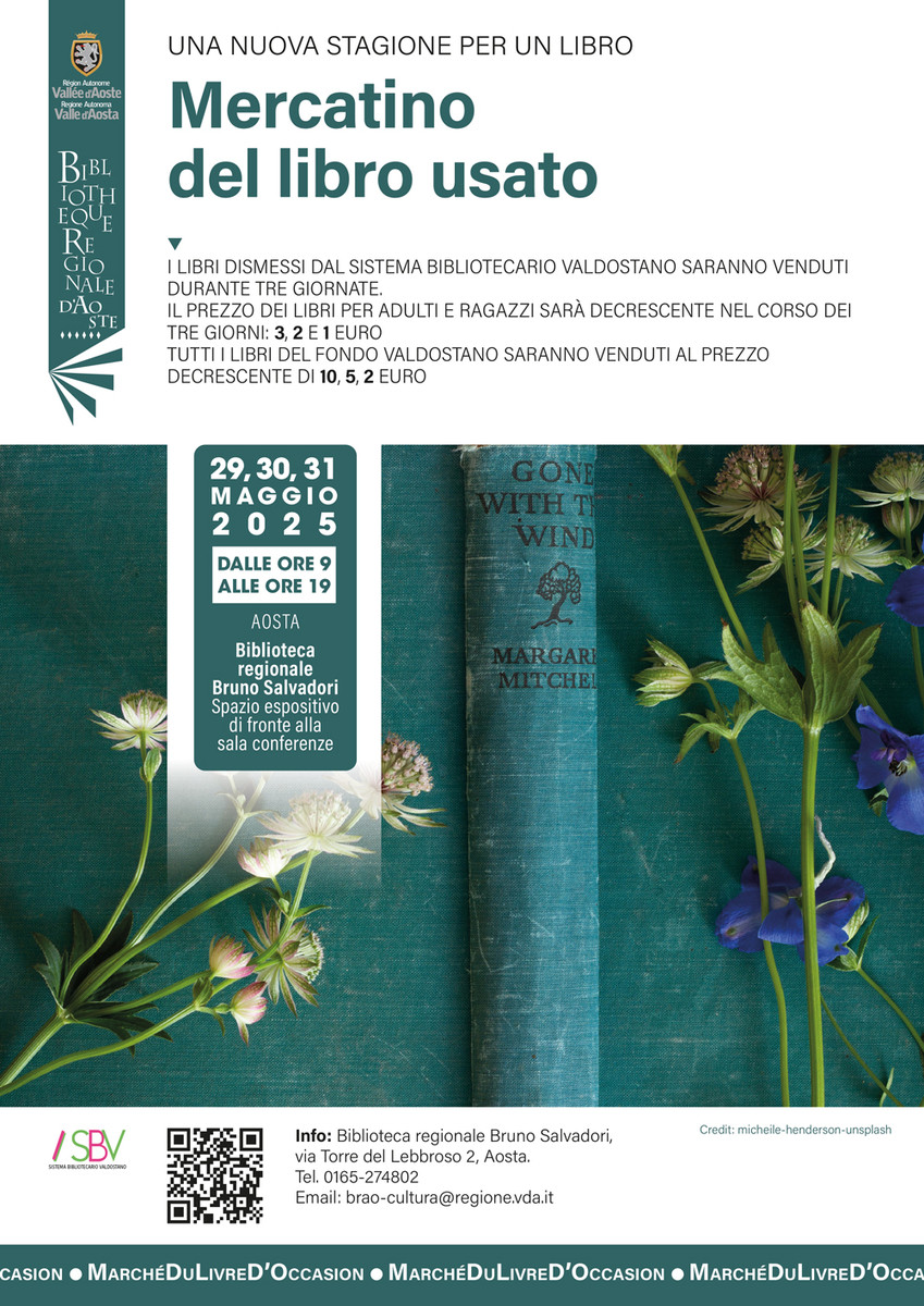L’Assessorato dei Beni e Attività culturali, Sistema educativo e Politiche per le relazioni intergenerazionali informa che, come ogni anno in autunno e primavera, la Biblioteca regionale Bruno Salvadori di Aosta mette in vendita dei libri dismessi dal Sistema bibliotecario valdostano.