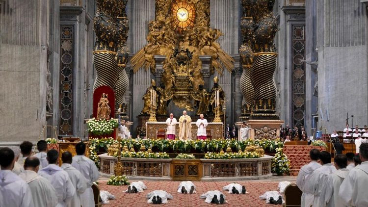La Liturgia di ordinazione presbiterale degli undici diaconi, di cui 7 del Pontificio Seminario Romano Maggiore e 4 del Collegio diocesano Redemptoris Mater, prosegue con gli impegni degli eletti, che si prostrano davanti al Vescovo di Roma mentre vengono recitate le litanie dei santi, l’imposizione delle mani, la preghiera di ordinazione recitata dal Papa, e infine la vestizione della stola e della casula. Il Papa unge con il sacro crisma le palme di ogni ordinato, e gli consegna il pane sulla patena e il calice con il vino, preparati per la Messa. Quiindi scambia con ognuno l'abbraccio di pace. Tutti i momenti della Liturgia sono accompagnati dal Coro della Diocesi di Roma diretto da monsignor Marco Frisina. Concelebrano con Leone XIV il cardinale Baldo Reina, vicario generale per la diocesi di Roma, altri cardinali, i vescovi ausiliari, i superiori dei seminari interessati e i parroci degli ordinandi. Per la Liturgia eucaristica, intorno all'altare e ai lati del Vescovo di Roma e del suo vicario, si dispongono gli undici presbiteri appena ordinati.
