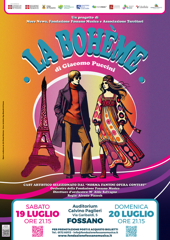 La locandina accompagna l’allestimento dell’opera La bohème, che andrà in scena sabato 19 luglio alle ore 21:00 presso l’Auditorium Calvino-Paglieri di Fossano (CN), nell’ambito del Norma Fantini Opera Contest: un evento reso possibile grazie alla sinergia tra l’Associazione Culturale Territori, More News e Fondazione Fossano Musica.