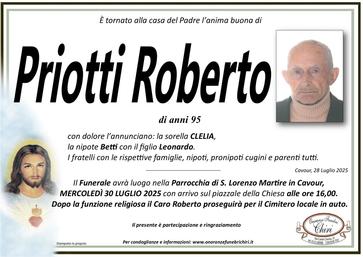 Roberto Priotti di Cavour (To) ha concluso, dopo lunghe sofferenze affrontate con dignità e silenzio, la sua lunga e laboriosa esistenza terrena. Aveva 95 anni. Un'intera vita spesa con dedizione assoluta al lavoro, alla famiglia e alla sua amata terra.