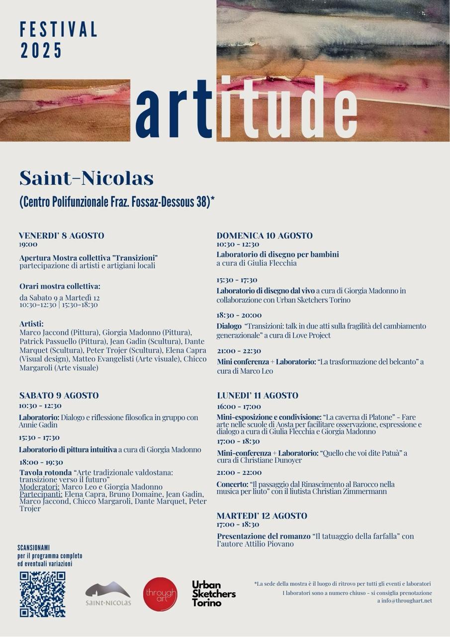 Il cuore del festival sarà il Centro Polifunzionale di Saint-Nicolas, base logistica e centro gravitazionale di tutte le attività. Qui si terrà la mostra collettiva Transizioni, che raccoglie le opere di nove artisti italiani, ma anche performance, laboratori per adulti e bambini, talk, incontri filosofici e musicali. Tra i nomi in programma, alcuni volti noti della scena artistica valdostana e non solo: Annie Gadin, Bruno Domaine, Elena Capra, Marco Jaccond, Patrick Passuell, Jean Gadin, Peter Trojer, insieme a facilitatori e collettivi come Urban Sketchers Torino e Love Project.