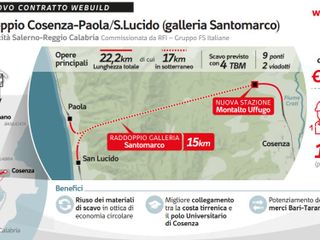 MILANO (ITALPRESS) - Il Gruppo Webuild, in consorzio, si è aggiudicato il contratto da 1,6 miliardi di valore complessivo (di cui il 60% in quota Gruppo Webuild) sulla nuova linea AV/AC Salerno Reggio-Calabria per la realizzazione del "Raddoppio Paola-Cosenza" che si estenderà per circa 22,2 km in Calabria, quasi tutti in sotterraneo. Opera principale del progetto, commissionato da Rfi sarà la nuova Galleria Santomarco, lunga oltre 15 km, uno degli interventi strategici della linea.Il progetto contribuirà a migliorare significativamente la capacità e l'efficienza del collegamento ferroviario tra la costa tirrenica e l'entroterra calabrese, garantendo una migliore accessibilità a Cosenza e potenziando l'itinerario merci Bari-Taranto-Gioia Tauro. La nuova Galleria Santomarco si svilupperà a circa 100 metri da quella già esistente a binario unico, che sarà dismessa una volta completati i lavori. Per lo scavo della galleria, a doppia canna e a singolo binario, si prevede l'impiego di 4 talpe meccaniche. I lavori saranno realizzati da Webuild alla guida del consorzio con Ghella, Pizzarotti e Seli, la controllata del Gruppo specializzata nel tunnelling, e si stima che verranno occupate fino a 1.500 persone, tra personale diretto e di terzi. Il tracciato attraverserà la provincia di Cosenza, passando per i comuni di Paola, San Lucido, Rende, Montalto Uffugo, San Vincenzo la Costa e San Fili. Nel complesso, è prevista la costruzione di nove ponti e due viadotti ferroviari: un viadotto, lungo 350 metri, attraverserà l'autostrada A2, un secondo, di 205 metri, scavalcherà il torrente Settimo. Sarà realizzata anche una nuova stazione a Montalto Uffugo, a servizio del territorio e del polo universitario di Rende. L'opera rappresenta un tassello fondamentale per il completamento della nuova linea alta velocità/alta capacità Salerno-Reggio Calabria, che contribuirà allo sviluppo economico e sociale del Mezzogiorno nell'ambito del corridoio Scandinavo-Mediterraneo della rete Ten-T, asse strategico per la connessione del Sud della penisola con il Nord Italia e l'Europa. La realizzazione dell'intera linea garantirà l'accesso al trasporto ferroviario veloce e ad alta capacità ad aree che oggi ne sono escluse, come Cilento, Vallo di Diano, costa jonica, alto e basso cosentino e il Reggino, favorendo la crescita economica e turistica. Una volta ultimata, l'opera permetterà di ridurre i tempi di percorrenza tra Roma e Reggio Calabria. Sulla stessa linea Salerno-Reggio Calabria, Webuild sta già realizzando il lotto 1A Battipaglia-Romagnano, che rappresenta il primo tassello dell'intera infrastruttura e prevede la realizzazione di 35 km di nuova linea, includendo il bivio per l'interconnessione alla tratta Potenza-Metaponto. In totale ad oggi sono circa 60 i km di linea che il Gruppo Webuild realizzerà sulla tratta ad alta velocità tra Salerno e Reggio Calabria. Il raddoppio della tratta Paola Cosenza della linea alta velocità/alta capacità Salerno-Reggio Calabria rientra tra 19 i progetti che Webuild sta realizzando nel Sud Italia, isole comprese, tra i quali le grandi opere che prevedono la realizzazione di oltre 320 chilometri di linea ferroviaria ad alta velocità ed alta capacità. Per la realizzazione di questi progetti Webuild occupa ad oggi nel Mezzogiorno 8.700 persone, tra personale diretto e di terzi, con il coinvolgimento di 7.600 aziende della filiera da inizio lavori.(ITALPRESS).-Foto: ufficio stampa Webuild-