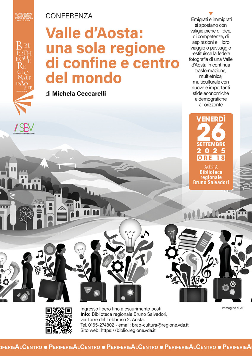 L’Assessorato dei Beni e Attività culturali, Sistema educativo e Politiche per le relazioni intergenerazionali informa che venerdì 26 settembre, alle ore 18, presso la sala conferenze della Biblioteca regionale Bruno Salvadori di Aosta, nell’ambito della rassegna Periferie al centro, è in programma un incontro con Michela Ceccarelli, dal titolo “Valle d’Aosta: una sola regione di confine e centro del mondo”.