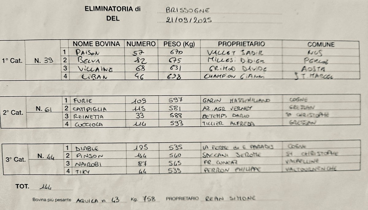 Dopo quattro mesi di fermo a causa della dermatite nodulare contagiosa (LSD), la tradizione è tornata a farsi sentire. A Brissogne, domenica 21 settembre, si è svolta l’eliminatoria che ha riaperto il 68ème Concours Régional: un ritorno atteso, vissuto con emozione da allevatori e pubblico.