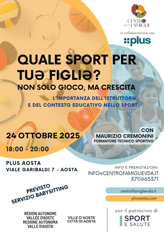 Per dare continuità alla proposta, il 24 ottobre alle 18.00 presso lo spazio Expo in via Garibaldi, il Centro per le Famiglie e Plus organizzano la conferenza Quale sport per tuo figlio?, dedicata all’importanza dell’istruttore e del contesto educativo in ambito sportivo. Interverrà Maurizio Cremonini, formatore tecnico sportivo e responsabile tecnico nazionale del settore minibasket.