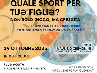Per dare continuità alla proposta, il 24 ottobre alle 18.00 presso lo spazio Expo in via Garibaldi, il Centro per le Famiglie e Plus organizzano la conferenza Quale sport per tuo figlio?, dedicata all’importanza dell’istruttore e del contesto educativo in ambito sportivo. Interverrà Maurizio Cremonini, formatore tecnico sportivo e responsabile tecnico nazionale del settore minibasket.