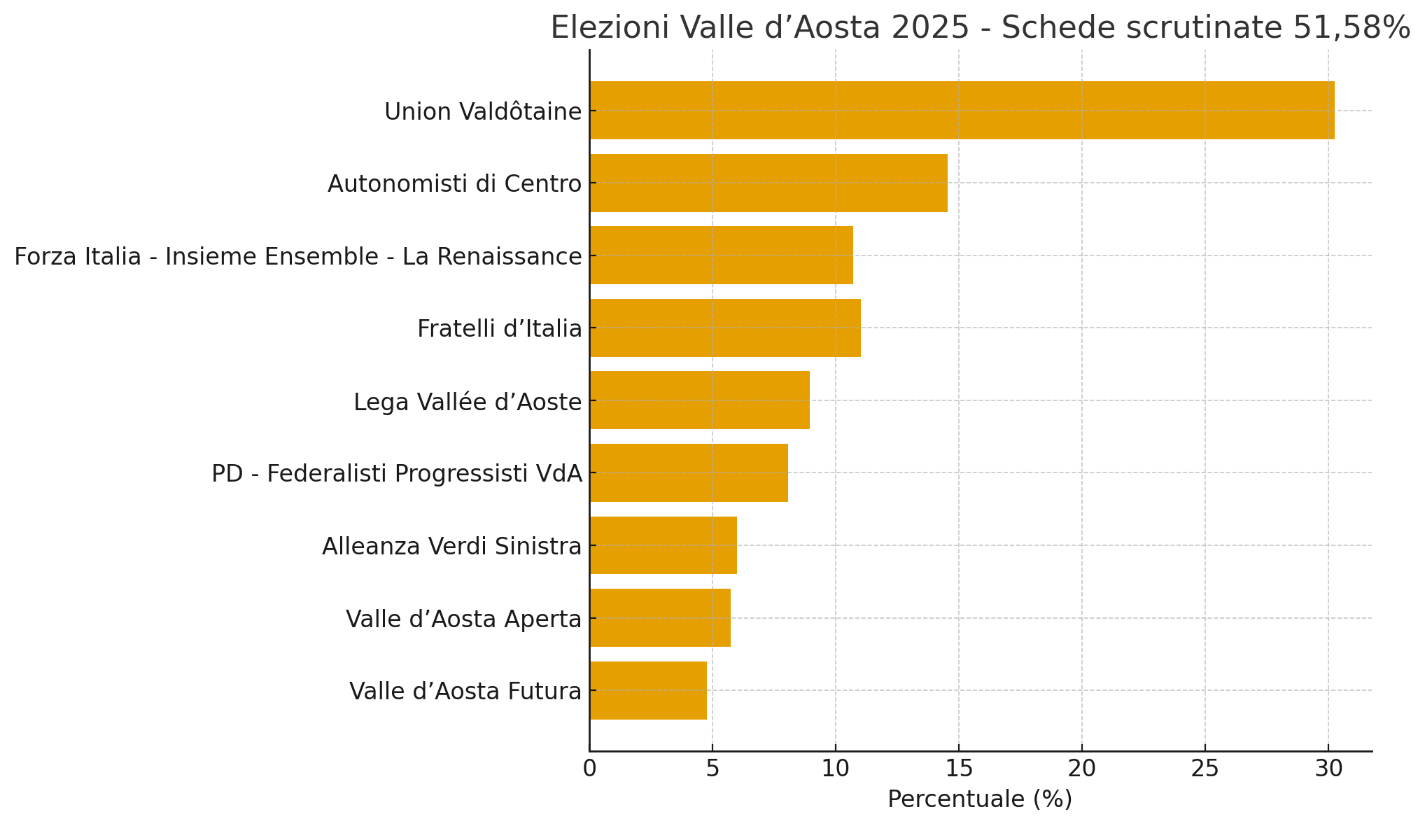 La fotografia che emerge dallo spoglio di 33.533 schede, pari al 51,58% del totale, è chiara: l’autonomismo valdostano non solo tiene, ma guadagna terreno. L’Union Valdôtaine vola a 9.455 voti (30,24%), mentre gli Autonomisti di Centro registrano un sorprendente 14,54% (4.545 voti). Insieme, superano il 44%, diventando l’asse politico più consistente della regione.