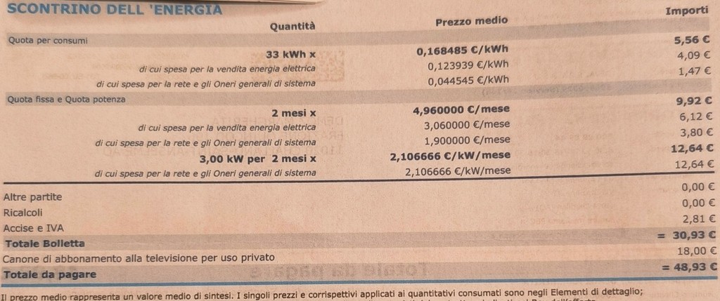 Arriva la bolletta dell'energia elettrica per l'abitazione di mia mamma, che ha 85 anni ed è pensionata col minimo, dopo una vita di duro lavoro agricolo. Prende circa 874 (ottocentosettantaquattro) euro al mese di pensione, reversibilità del mio povero papà compresa. La bolletta è di circa 31 euro a bimestre e varia poco nel tempo, perché la mamma passa molto tempo con noi in famiglia, ma ha la sua casa e il suo contatore luce.