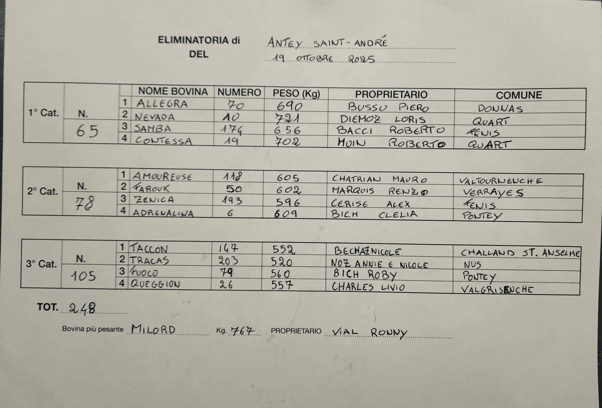 Ben 248 bovine – suddivise in 65 di prima categoria, 78 di seconda e 105 di terza – si sono contese un posto nell’attesissima Finale Regionale, che si terrà all’Arena Croix-Noire il 25 e 26 ottobre. A spuntarla, con la forza, l’eleganza e la grinta che solo le vere regine possiedono, sono state dodici protagoniste destinate a far parlare di sé.
