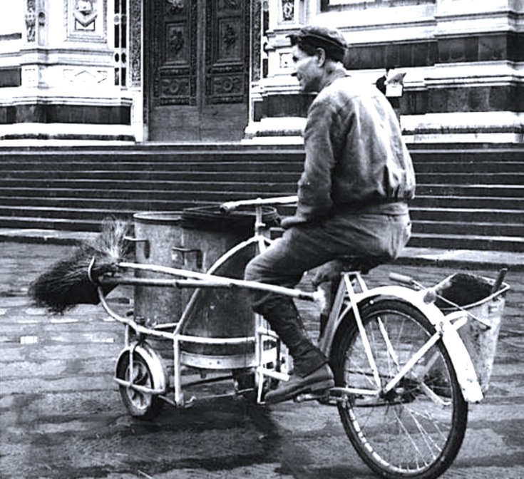 Tanto è vero che i famosi netturbini — quegli omini simpatici dotati di ramazza di saggina, paletta e bicicletta a tre ruote con davanti il bidone (quelli della mia età se li ricordano) — giravano per le strade del centro e, armati di buona volontà, tenevano la città pulita.