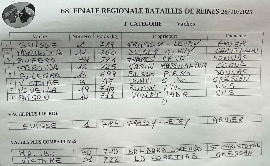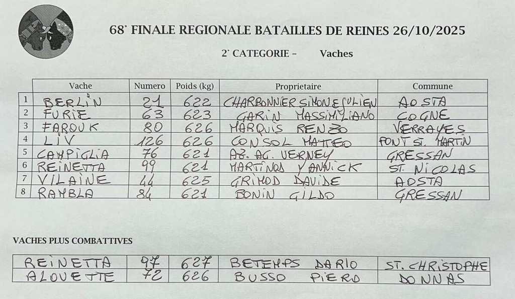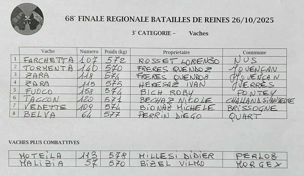 Tre nomi, tre storie di allevatori e di pascoli, ma un’unica grande passione condivisa: quella per la regina delle Batailles, simbolo vivente di una Valle che, pur tra i cambiamenti dei tempi, continua a riconoscersi nelle sue radici, nella fierezza dei suoi animali e nella comunità che li celebra.