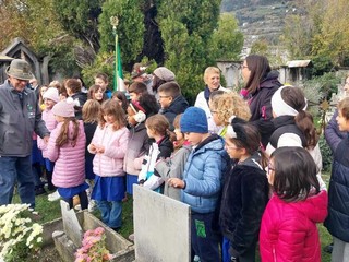 In silenzio, con lo sguardo curioso di chi per la prima volta varca il cancello del Cimitero di Sant’Orso, due classi delle vicine scuole elementari fanno il loro ingresso in questo luogo di culto, custode di storie che le maestre, nei giorni precedenti, hanno cominciato a raccontare.