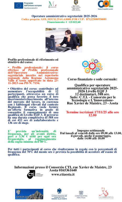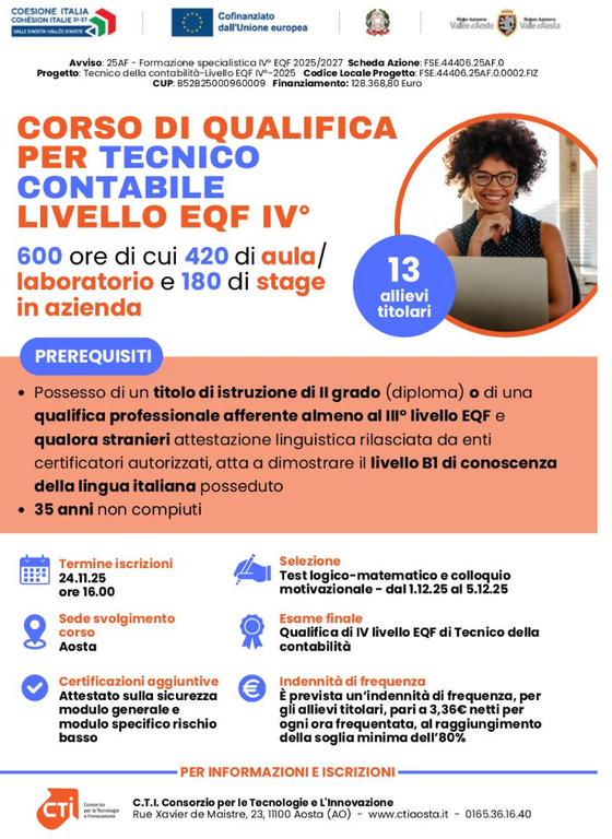 Il profilo di Tecnico della contabilità è stato scelto per la sua trasversalità e per la crescente necessità di aggiornamento legata alle normative fiscali, alle procedure aziendali e agli strumenti digitali in evoluzione. La sede del corso sarà presso l’Ente in Rue Xavier de Maistre, 23, Aosta.