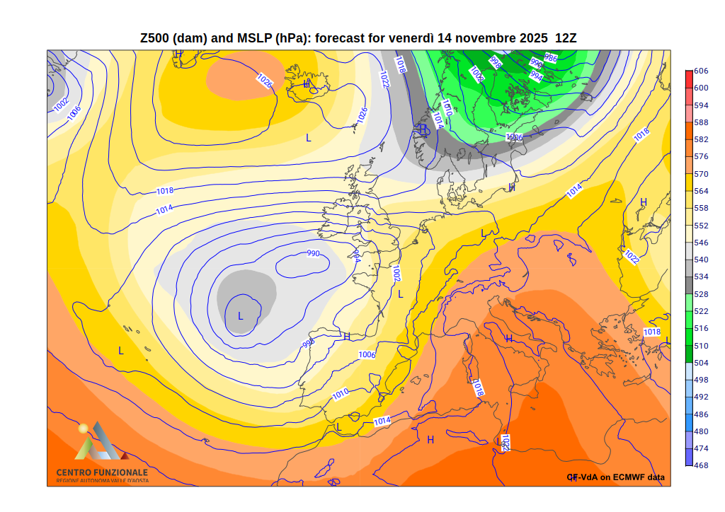 La pressione rilevata ad Aosta alle 7.00 di questa mattina è di 1026 hPa, indice di un campo relativamente stabile, ma il quadro generale è destinato a cambiare: una depressione chiusa sull’Atlantico si avvicina al Golfo di Biscaglia e favorisce correnti umide verso le Alpi occidentali, portando nuvolosità diffusa e alcuni passaggi di precipitazioni. Per la Valle d’Aosta, si prevedono fenomeni generalmente lievi, ma non si esclude qualche episodio isolato di natura convettiva, soprattutto sui settori più occidentali e di confine con il Piemonte.