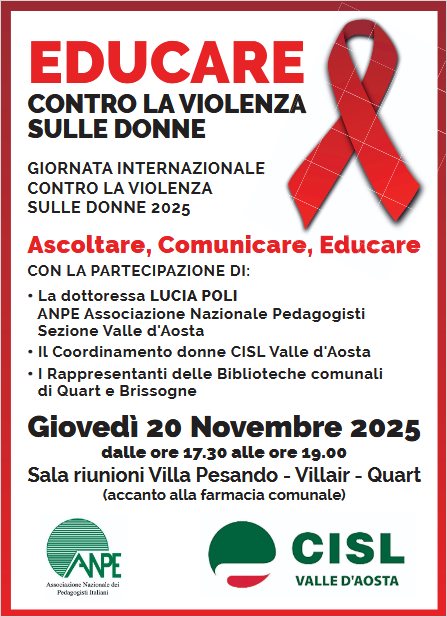 Ogni due giorni, in Italia, una donna viene uccisa da un uomo. È una statistica implacabile, che attraversa i comunicati, i notiziari, le relazioni istituzionali. Ma dietro i numeri ci sono facce, vite, famiglie, sogni che non diventano mai vecchi abbastanza per spegnersi al mondo. Non servono celebrazioni rituali, servono azioni, strumenti, formazione, comunità. È da questa convinzione che nasce l’evento “Educare contro la violenza sulle donne: ascolto, comunicazione, educazione contro la violenza di genere”, promosso dalla CISL Valle d’Aosta insieme alla Associazione Nazionale Pedagogisti Italiani – sezione Valle d’Aosta.