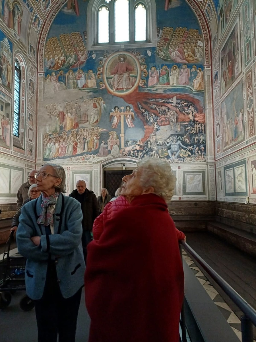 Nella Cappella intitolata a Santa Maria della Carità, lo straordinario ciclo pittorico realizzato da Giotto rappresenta uno dei massimi capolavori dell’arte ad affresco. Rosa e Teresa non riuscivano a staccare lo sguardo dalla volta: “Ci sembrava di vivere un momento di autentica magia. Attorno a noi c’era un gran silenzio, non è possibile avere guide per non disturbare l’atmosfera, ma è stato ugualmente bellissimo. Eravamo rapite da quel manto azzurro di stelle, dagli sguardi e dai sentimenti dei personaggi: stupore, dolore, disperazione, gioia, spiritualità. Ogni scena è solenne e sacrale. Non credevamo di poter provare emozioni così profonde e intense e siamo grate al C.T.A. per averci dato questa possibilità.”