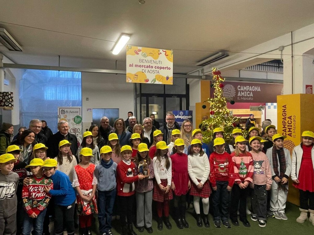 Il Mercato Coperto di Campagna Amica, in piazza Cavalieri di Vittorio Veneto, questa mattina non era soltanto un luogo di vendita e profumi familiari. Era una piccola piazza di paese, un crocevia di volti, mani e storie, dove la tradizione ha incontrato il presente con la naturalezza delle cose vere. Tra banchi di formaggi e miele, voci di bambini e saluti istituzionali, Coldiretti e Confartigianato Valle d’Aosta hanno consegnato a Monsignor Franco Lovignana, Vescovo di Aosta, la statuina del Presepe 2025.