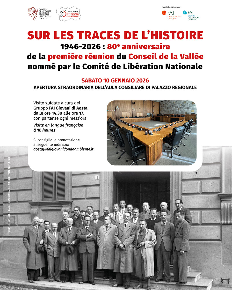 Sabato 10 gennaio 2026, il pubblico avrà la possibilità di camminare in quegli stessi spazi, al primo piano di Palazzo regionale, e di sentire da vicino la storia grazie alle visite guidate del Fai Giovani Aosta. Ogni stanza, ogni oggetto, ogni fotografia racconta storie di impegno, coraggio e visione collettiva. I giovani volontari accompagneranno i visitatori attraverso un percorso fatto di foto d’epoca, citazioni e testimonianze, alternando momenti di riflessione a curiosità spesso dimenticate. Partenze ogni mezz’ora, con ritrovo in piazza Deffeyes, e una visita speciale in lingua francese alle ore 16. Prenotazione consigliata via e-mail a aosta@faigiovani.fondoambiente.it.