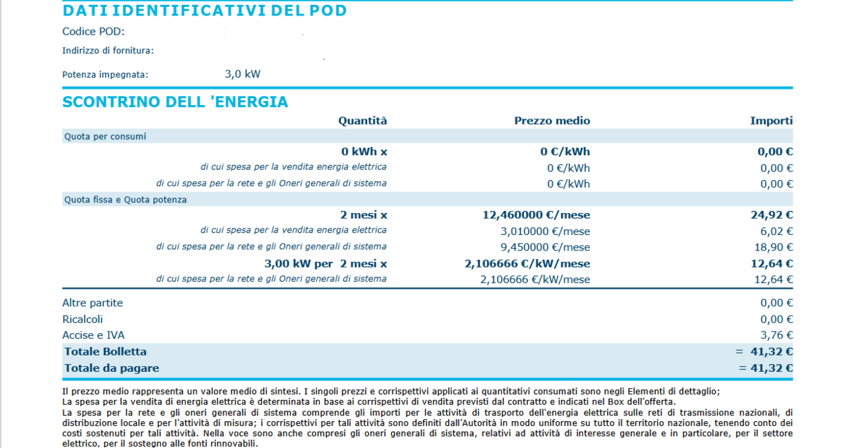 Non è una provocazione né un artificio retorico, ma un dato oggettivo, certificato dalla bolletta. A fronte di 0 kWh consumati e 0 euro di spesa per l’energia, il totale da pagare ammonta a 41,32 euro, interamente composto da quote fisse, quota potenza, oneri di sistema, accise e IVA.