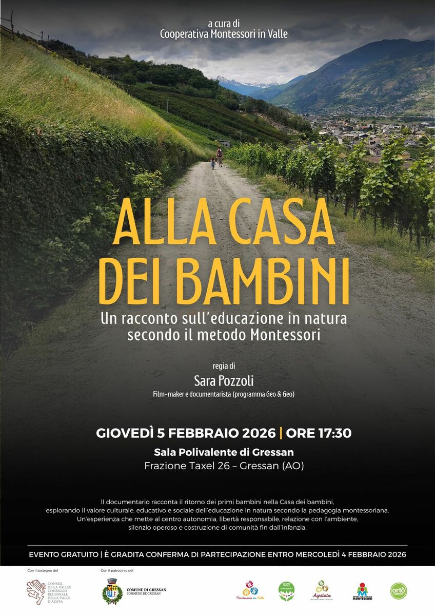 Giovedì 5 febbraio, alle 17.30, la sala polivalente del Comune di Gressan, in frazione Taxel 26, ospiterà l’anteprima del documentario “Alla Casa dei bambini”, lungometraggio dedicato all’esperienza dell’“Educazione in natura con metodo”, progetto promosso dalla Cooperativa Montessori in Valle. La proiezione, che precede la circuitazione dell’opera nei festival cinematografici nazionali, rappresenta non solo un momento culturale, ma anche un’occasione di riflessione pubblica su un modello educativo che negli anni ha saputo dialogare con le istituzioni regionali e locali.