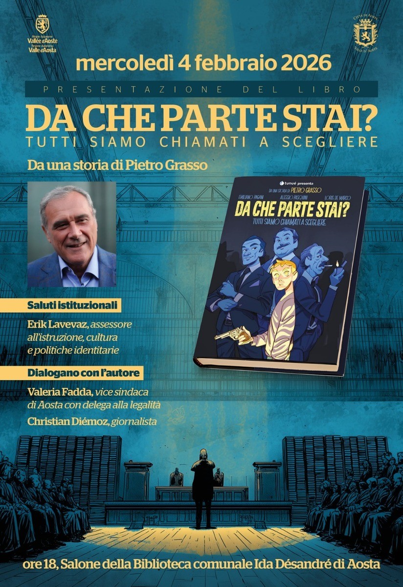 Mercoledì 4 febbraio 2026, alle ore 18, presso il Salone della Biblioteca comunale Ida Désandré di Aosta, si terrà un incontro con Pietro Grasso in occasione della presentazione del graphic novel “Da che parte stai? Tutti siamo chiamati a scegliere”, ispirato a una storia di Pietro Grasso, ex magistrato, Procuratore nazionale antimafia ed ex Presidente del Senato.