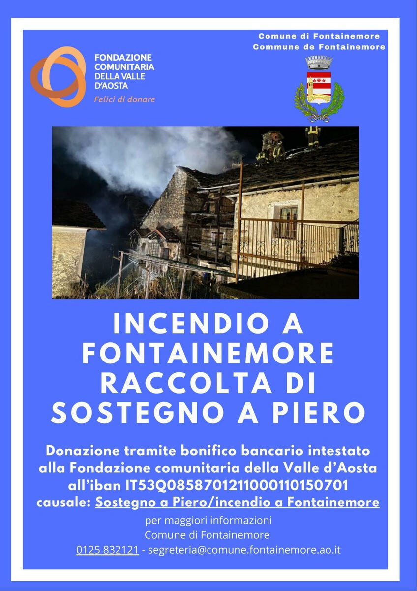 La Fondazione comunitaria della Valle d’Aosta e il Comune di Fontainemore ringraziano sin d’ora chi vorrà partecipare con un gesto di generosità. Anche piccolo. Perché quando tutto è andato perduto, anche poco può significare moltissimo.