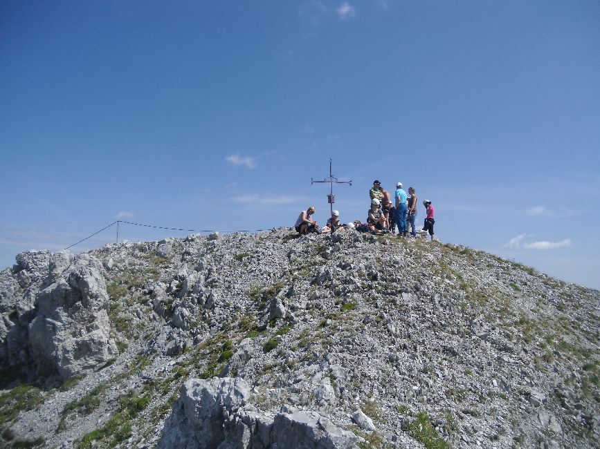 Per rocce montonate di facile accesso si arriva a una spaccatura che caratterizza la vetta. Si sale (I grado) sulla cima di sinistra, la più alta.