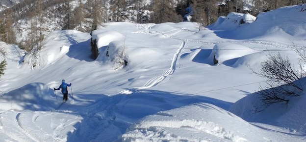 L’esposizione, completamente a nord nella parte bassa del bosco, offre spesso bella neve polverosa, purché abbondante. La conca finale è molto ampia, con bei pendii. L’ultimo tratto per raggiungere la croce del colle deve essere effettuato con neve sicura, perché può scaricare sia dai pendii di destra sia da quelli di sinistra.