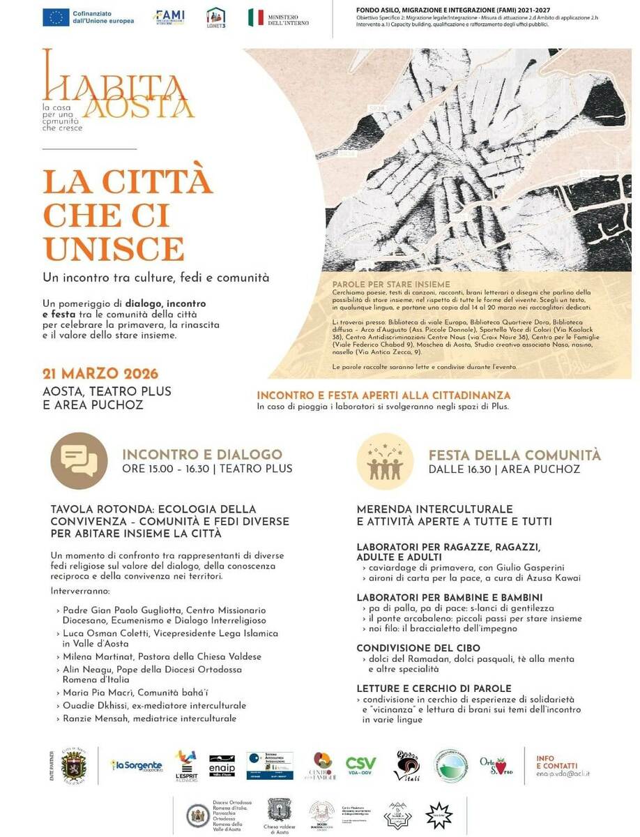 Aosta prova a raccontarsi per ciò che è, o forse per ciò che ambisce a essere: una città capace di tenere insieme differenze, storie e identità. Lo farà giovedì 21 marzo con un pomeriggio interamente dedicato al dialogo tra culture, fedi e comunità, articolato tra gli spazi del Plus e l’area del Parco Puchoz. Un’iniziativa che non si limita a mettere in fila eventi, ma che prova a costruire un senso, quello di una comunità che si riconosce nella pluralità e nella relazione.