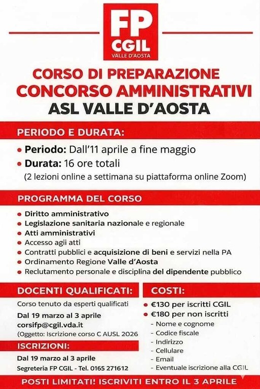 Le iscrizioni dovranno essere inviate nel periodo compreso tra il 19 marzo e il 3 aprile tramite email all’indirizzo corsifp@cgil.vda.it,