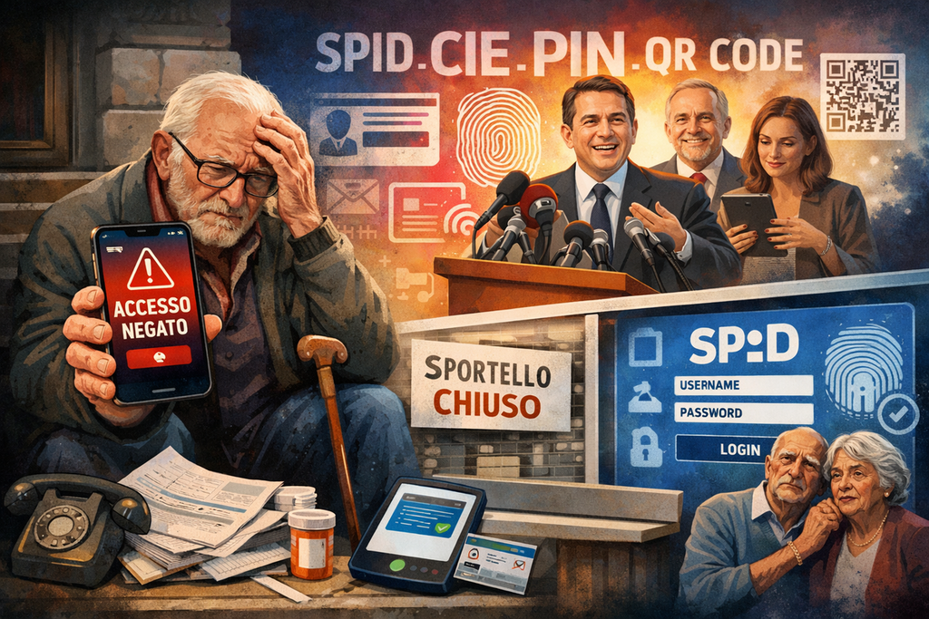 Una verità che brucia. Una verità che i nostri amministratori — sindaci, assessori, consiglieri regionali — farebbero bene a tatuarsi sul palmo della mano, così da leggerla ogni volta che firmano una delibera, ogni volta che salgono su un palco, ogni volta che si preparano a pronunciare le loro parole preferite: SPID, CIE, PIN, OTP, PEC, app, QR code, fascicolo sanitario elettronico, piattaforma digitale, sportello online, accesso riservato, identità digitale.