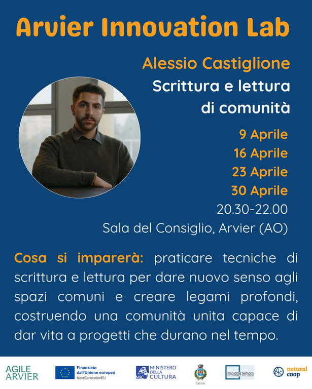 Come può la scrittura trasformarsi in un’azione collettiva capace di rigenerare i legami e dare nuovo senso agli spazi comuni? Nel mese di aprile, il Comune di Arvier accoglie Alessio Castiglione, scrittore, pedagogista e ricercatore esperto in pratiche partecipative, per un nuovo ciclo di incontri nell’ambito della residenza Arvier Innovation.