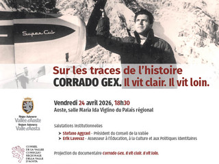 Assesseur régional puis député, animé par une passion pour l’aviation et un regard tourné vers l’avenir, Corrado Gex a marqué politique du début des années soixante. À l’occasion du 60e anniversaire de sa mort, le Conseil de la Vallée et la Région lui rendent hommage avec la projection du documentaire "Corrado Gex. Il vit clair. Il vit loin.", réalisé par Joseph Péaquin. Le rendez-vous - organisé dans le cadre du cycle de rencontres "Sur les traces de l’histoire - se tiendra vendredi 24 avril 2026, à 18h30, dans la salle Maria Ida Viglino du Palais régional, à Aoste.