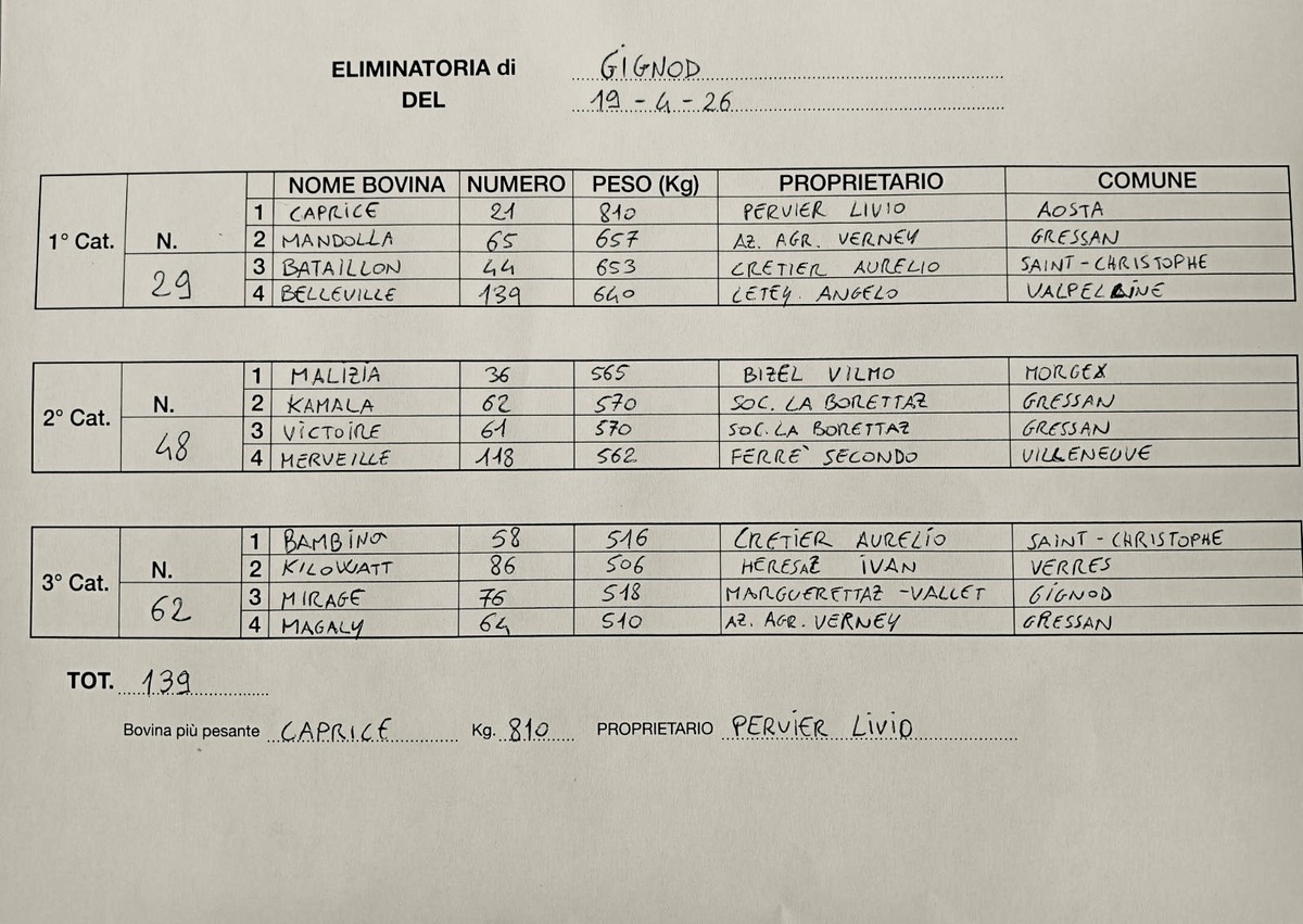 La terza categoria parla il linguaggio del futuro, e a Gignod il nome da ricordare è Bambinò, di Aurelio Cretier di Saint-Christophe. Una vittoria netta in finale contro Kilowatt di Ivan Heresaz di Verrès, che conferma il valore di un allevamento attento alle nuove generazioni.