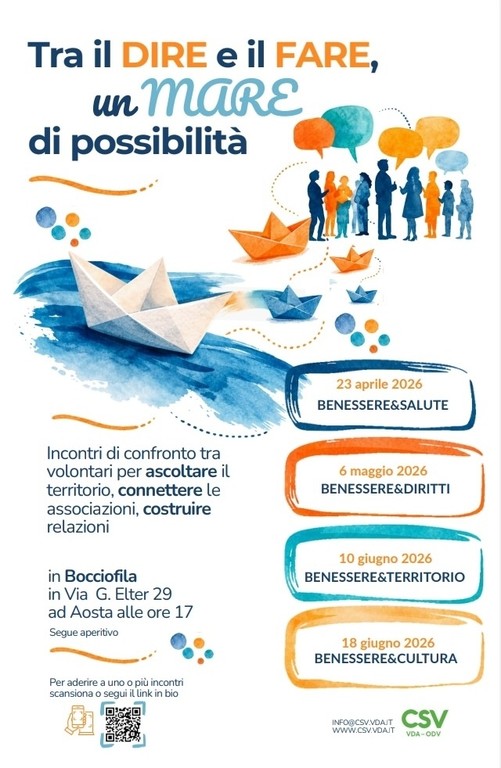 Il primo appuntamento, dedicato al tema “Benessere & Salute”, si è svolto alla Bocciofila di Aosta coinvolgendo volontari e rappresentanti di 27 associazioni in un momento di dialogo diretto e partecipato. L’incontro ha rappresentato un’occasione concreta per riflettere sul significato di benessere nelle sue diverse dimensioni – fisica, mentale ed emotiva, sociale e di prevenzione – e sul ruolo che le organizzazioni svolgono quotidianamente per promuoverlo all’interno della comunità.